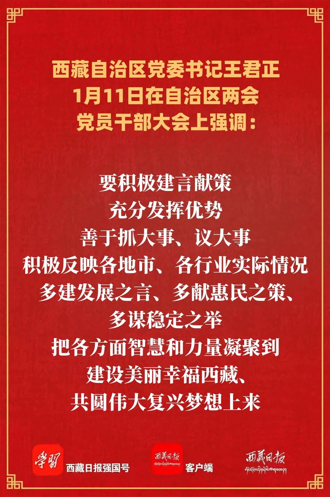 王君正强调,人大代表、政协委员肩负着全区各族人民的期望和重托,使命光荣、责任重大。要强化政治担当,围绕中心、服务大局,认真做好审议协商工作,以科学严谨、认真负责的态度和求真务实的作风,听取、讨论、审议大会各项报告、草案,充分发扬民主,提出真知灼见,广泛凝聚智慧,使各项报告更加符合党中央精神、符合西藏实际、符合人民意愿,成为引领全区长治久安和高质量发展的指导性文件。要积极建言献策,充分发挥优势,善于抓大事、议大事,积极反映各地市、各行业实际情况,多建发展之言、多献惠民之策、多谋稳定之举,把各方面智慧和力量凝聚到建设美丽幸福西藏、共圆伟大复兴梦想上来。