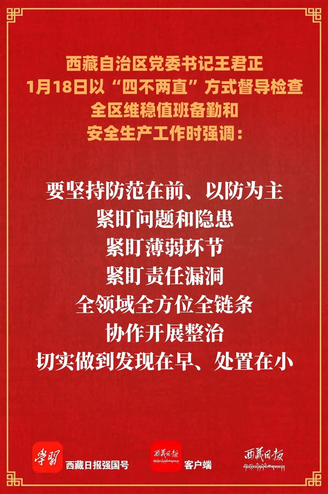 18日下午,自治区党委书记王君正以“四不两直”方式对全区维稳值班备勤和安全生产工作进行督导检查。强调,要始终坚持人民至上、生命至上,时刻关心人民群众生产生活,全力以赴做好护稳定、防风险、除隐患、保安全各项工作,确保人民群众生命财产安全,确保社会大局持续和谐稳定。