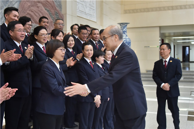 3月29日下午,最高人民检察院党组书记、检察长张军接见参加全国扫黑除恶专项斗争总结表彰大会的检察系统代表和牺牲检察干警家属。