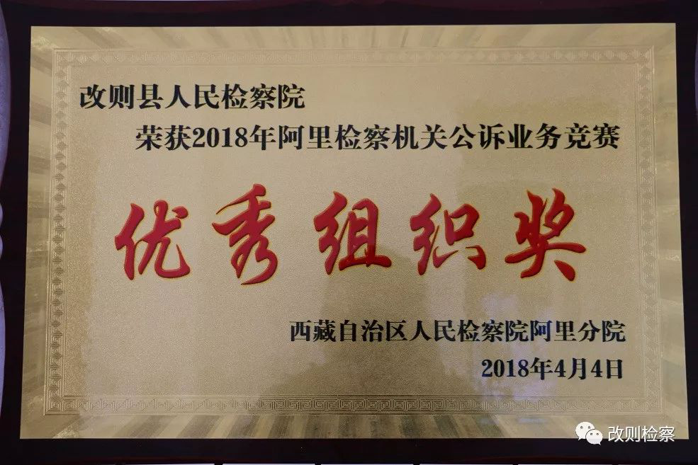 近日,改则县院在全地区检察机关公诉业务竞赛中喜获佳绩,集体荣获“优秀组织奖”,个人荣获“第一名、第三名”的突出成绩,收获全部四个奖项中的三个奖项。