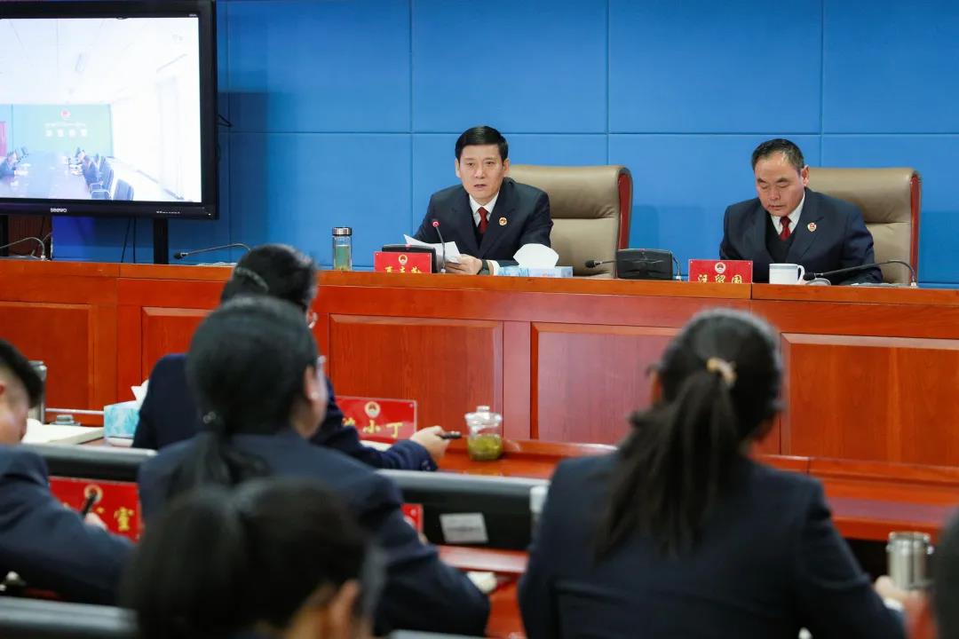 会议以视频形式开至全区三级检察院。区检院党组副书记、常务副检察长汪留国主持会议,区检院领导、检委会专职委员,区检院机关全体人员在主会场参加会议。