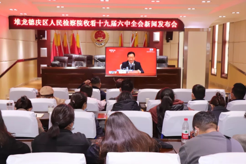 中国共产党第十九届中央委员会第六次全体会议,于2021年11月8日至11日在北京举行。为深入学习贯彻落实全会精神,进一步开展好新时代检察工作,11月12日,堆龙德庆区人民检察院组织全体干警、书记员在六楼会议室集中收看了十九届六中全会新闻发布会。