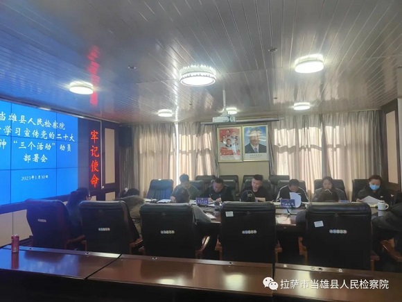 为进一步贯彻落实全区政法系统学习宣传贯彻党的二十大精神“三个活动”相关工作要求,1月30日,当雄县人民检察院召开学习宣传贯彻党的二十大精神“三个活动”动员部署会,传达学习《全区检察机关学习宣传贯彻党的二十大精神“三个活动”任务分工方案》等相关文件精神,对开展“学习二十大·铁军铸忠魂”学习教育活动、“改进执法司法作风·维护社会公平正义”活动、“丹心向核心·护航新征程”实践活动(简称“三个活动”)进行安排部署。院党组成员、副检察长姚东平主持会议,在家全体干警参加会议。