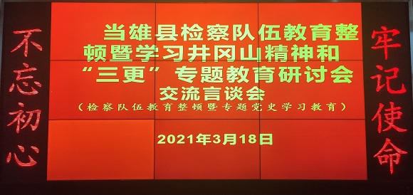 3月19日上午,当雄县检察队伍教育整顿工作领导小组副组长(党组副书记、副检察长)平措扎西主持召开当雄县检察队伍教育整顿暨党史学习教育活动为主题的“政治标准要更高、党性要求要更严、组织纪律性要更强”专题研讨会,会议围绕“三更”专题教育,就贯彻落实习近平总书记关于加强党的政治建设的重要论述,坚定政治信仰,强化政治领导,提高政治能力,净化政治生态,推动全面从严治党向纵深发展开展交流研讨。