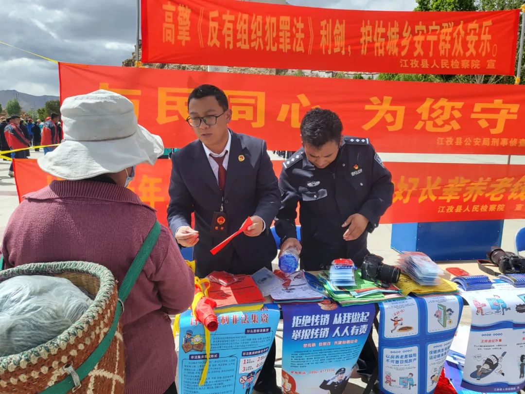 为深入宣传贯彻《中华人民共和国反有组织犯罪法》,提高人民群众对养老诈骗的防范意识,营造和谐、安全、稳定的社会环境, 5月13日,江孜县人民检察院联合江孜县公安局刑侦大队前往宗山广场、社区、养老院等地开展《反有组织犯罪法》及打击整治养老诈骗宣传活动。
