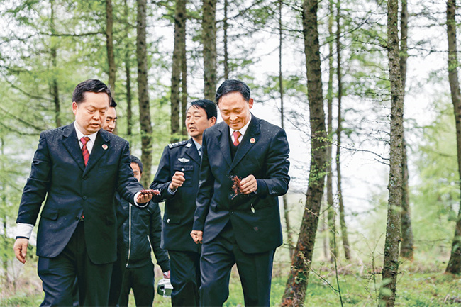 自2019年4月以来,重庆市巫溪县人民检察院联合陕西省镇坪县、湖北省竹溪县、神农架林区检察机关和林业部门,制定协作机制,通过共享跨区域刑事司法案件信息、建立联动巡山机制等,助力林业生态保护持续向好发展。图为2020年4月22日,重庆市巫溪县人民检察院联合陕西省镇坪县人民检察院组成的跨区域联合行动小组,在鸡心岭地区开展联合巡山活动。 新华社发 黄伟/摄