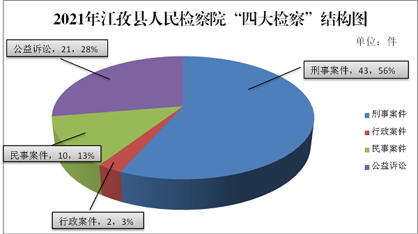 一年来,江孜县检察院在县委和市检察院的坚强领导下,在县人大及其常委会的有力监督下,坚持以习近平新时代中国特色社会主义思想为指导,认真学习贯彻落实党的十九大和十九届二中、三中、四中、五中、六中全会精神和中央第七次西藏工作座谈会精神,深入学习贯彻习近平总书记关于西藏工作的重要论述和新时代党的治藏方略,认真贯彻习近平法治思想和习近平总书记“七一”重要讲话及视察西藏时的重要讲话精神,增强“四个意识”、坚定“四个自信”、做到“两个维护”,以高度的政治自觉、法治自觉、检察自觉担当作为,以能动司法检察理念开启检察新征程,各项工作取得新进展。一年来,共办理各类案件76件,其中刑事检察43件,民事检察10件,行政检察2件,公益诉讼检察21件。