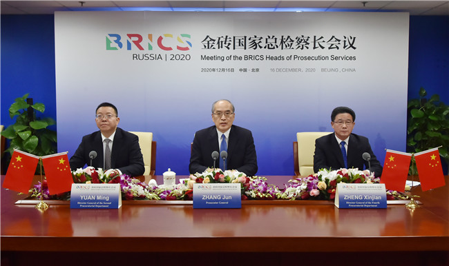 12月16日晚,中国最高人民检察院检察长张军率团在北京参加第四次金砖国家总检察长会议并致辞。