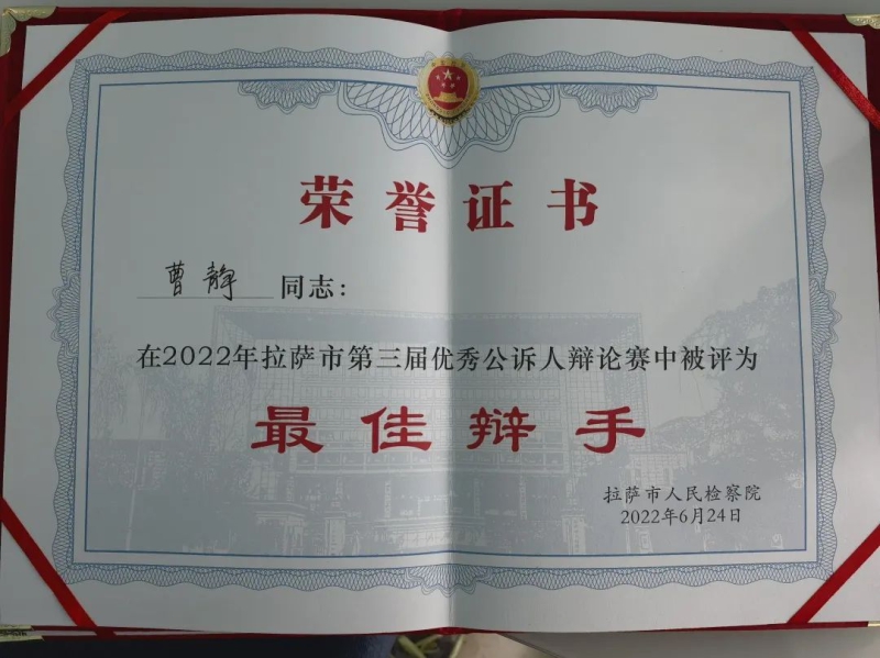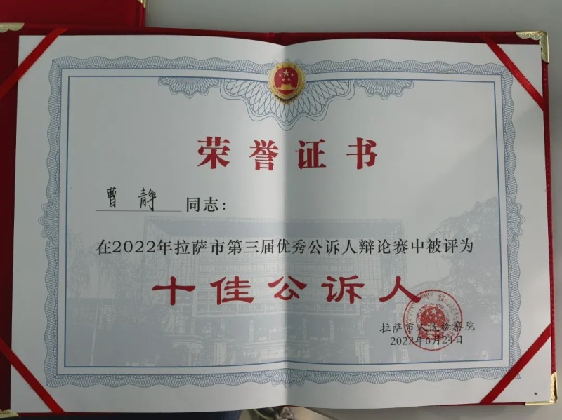 6月24日,曹静同志在拉萨市检察机关举行的第三届优秀公诉人业务竞赛中荣获十佳公诉人和最佳辩手。