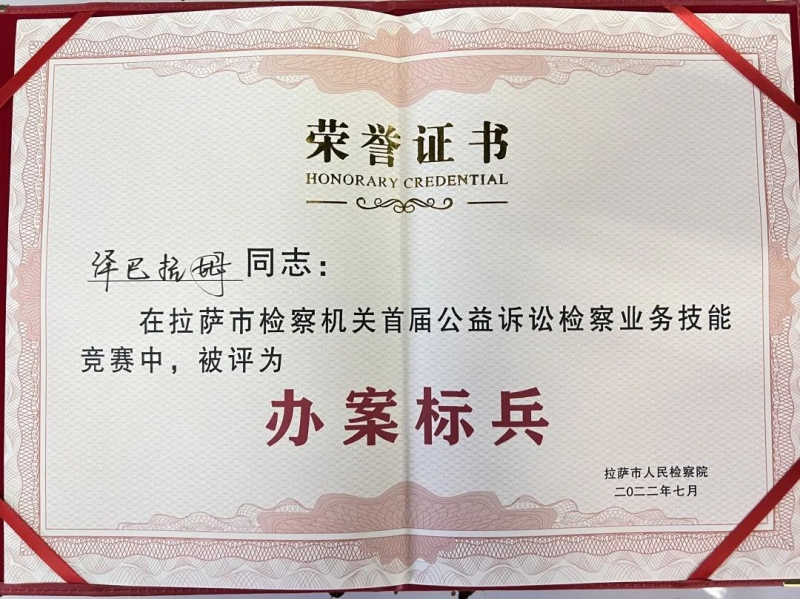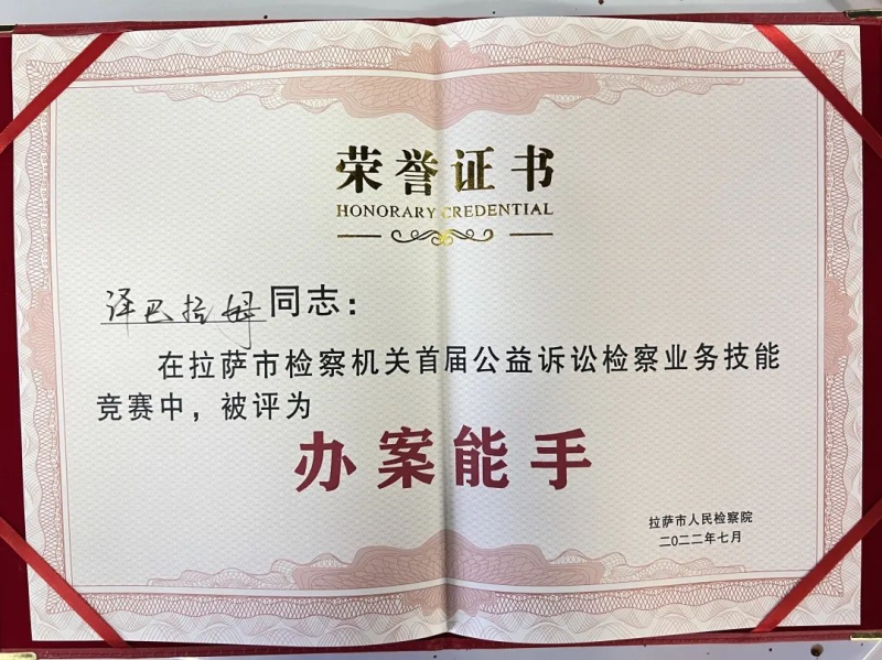 7月5日,泽巴拉姆同志在拉萨市检察机关首届公益诉讼检察业务技能竞赛被评为“办案能手”、“办案标兵”。