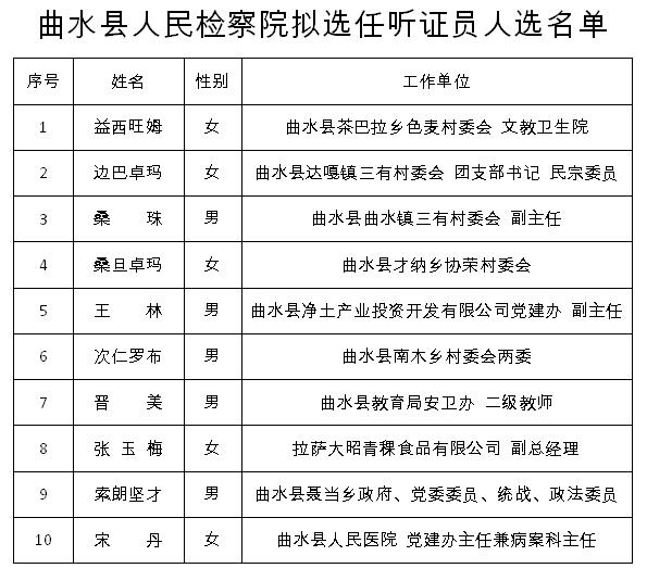 根据《曲水县人民检察院听证员选任工作的实施方案》《曲水县人民检察院听证员选任公示》的有关规定,经单位推荐报名,资格审查和组织考察等程序,确定10名拟选任曲水县人民检察院听证员,现将拟任曲水县人民检察院听证员名单予以公示(名单附后)。凡单位或个人对公示人员有异议,可通过电话、来访、来函等实名方式反映公示对象有关情况和问题,并对反映的情况或问题提供可调查核实的证明材料及有关线索,我们对反映问题者及反映问题将严格保密。