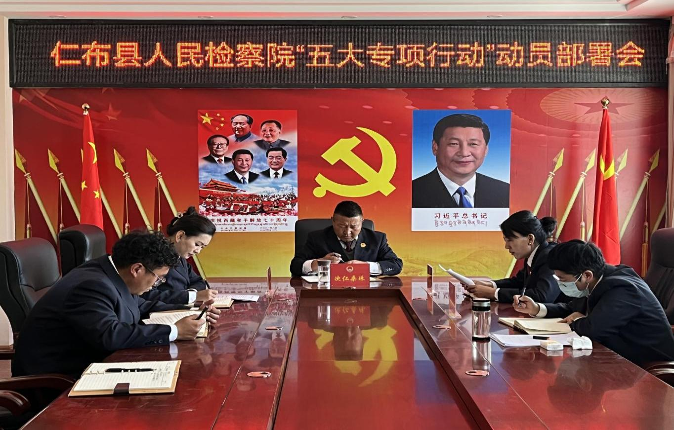10月8日下午,仁布县人民检察院召开开展“五大专项行动”动员部署会议,会议由院党组书记、检察长次仁桑珠主持,全院在家干警参加会议。会上传达学习了《全市政法机关开展“五大专项行动”细化实施方案》《日喀则市检察机关开展“五大专项行动”实施方案》,《仁布县人民检察院开展“五大专项行动”实施方案》,以及卓嘎检察长在全市“五大专项行动”动员部署会上的讲话精神和仁布县“五大专项行动”动员部署会上的讲话精神,党组书记、检察长次仁桑珠就进一步开展好五大专项行动进行安排部署。
