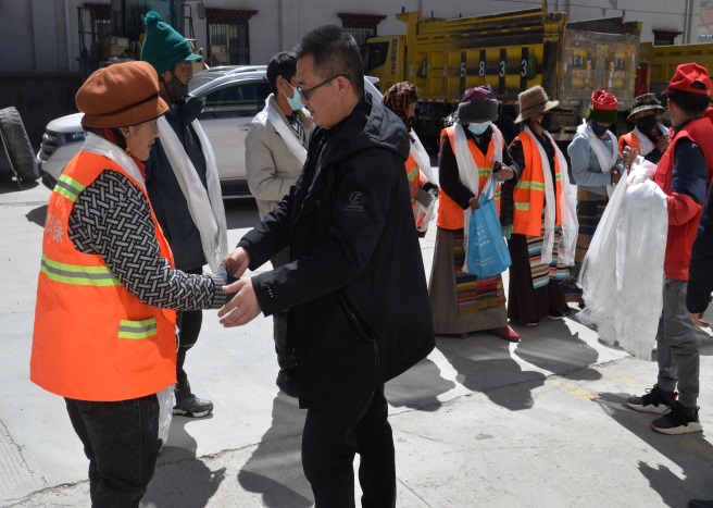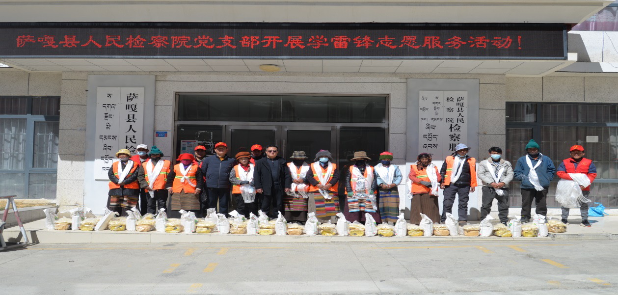 6日下午,我院全体党员自发组织捐款活动,为我县27名环卫工人开展慰问活动,在活动中,我院党组书记、检察长张宏同志与党支部书记、副检察长曲珠同志为环卫工人献上洁白的哈达,同时发放了砖茶、糌粑、面条等生活用品,共计人民币2052元,并表达了对环卫工人关心和关怀,感谢他们为建设美丽、干净、整洁的萨嘎离不开环卫工人的辛勤劳动。随后,我院组织全体党员干警清理院周边环境各个卫生死角,所有干警们以“不怕脏、不怕苦、不怕累”精神,把停车场大小便及丢弃的生活垃圾清理干净,从而营造干净整洁的生活环境,并发挥党员先锋模范作用。