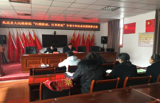 为更好的贯彻落实中央、自治区、地区打黑除恶专项斗争会议精神,贯彻落实县委、政府决策部署,切实增强“四个意识”,充分认识开展扫黑除恶打非治乱专项斗争的重大意义,2月27日上午,我院组织召开“扫黑除恶、打非治乱”专项斗争活动安排部署会议,由党组书记、检察长才旺多布杰主持,全体在岗干警参会。