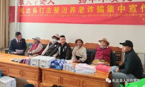 活动中,院党组成员、副检察长次仁以典型案例为切入点,重点向老人们介绍提供“养老服务”、投资“养老项目”、销售“养老产品”、宣传“以房养老”、代办“养老保险”、开展“养老帮扶”等实施诈骗背后的套路,以此警醒老年人要提高警惕性,不轻信“包治百病的灵丹妙药”和“天上掉馅饼的免费午餐”,强化警戒心理,遇事够冷静、多调查、多思考,不轻信谣言、不盲目跟风,做好个人信息保密的同时,坚持讲科学不讲迷信,保持乐观、积极的心态,以科学休养生息,以新闻丰富生活、以宣传强化意识。同时,鼓励通过12309检察服务中心寻求法律咨询和帮助。活动结束后,进行入户宣传,积极引导和全面提升识骗、防骗、拒骗能力。活动共发放宣传物品30件,宣传材料20份。