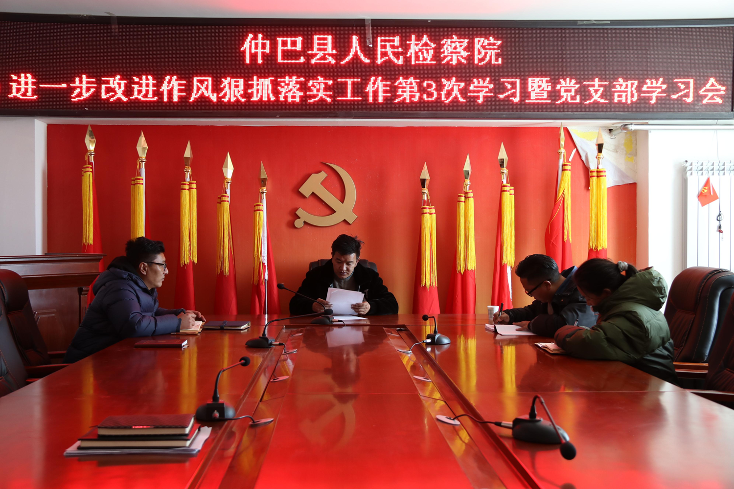 2月10日,我院召开改进作风狠抓落实工作第3次学习暨党支部学习会,会议传达学习《全市改进作风狠抓落实动员部署会上的讲话》精神、“党办通报[2022]第4期”。会议由党组成员、副检察长尼玛罗杰同志主持,在家全体干警参加学习会。